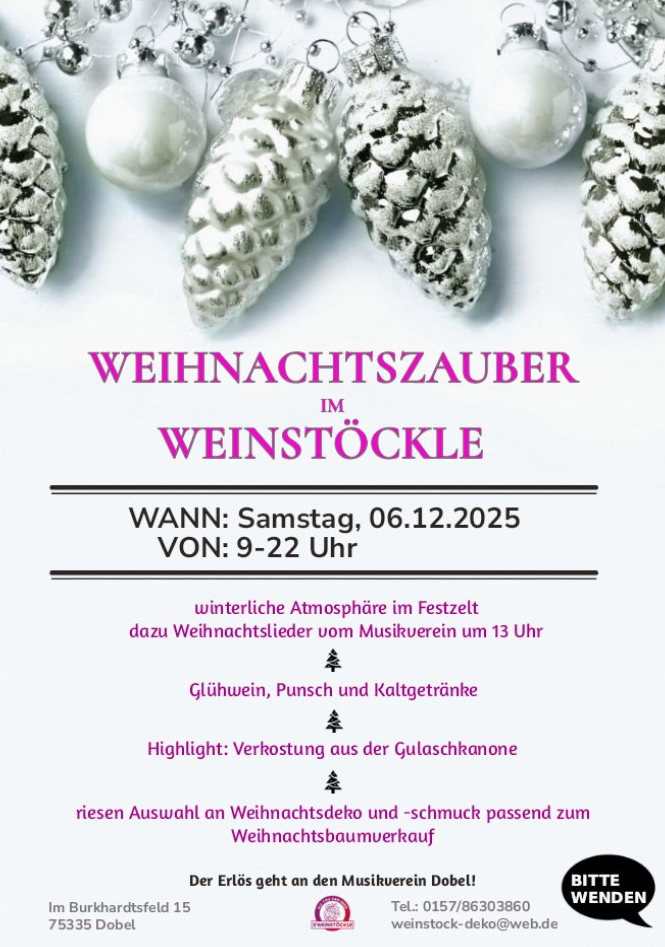 Winterliche Atmosphäre im Festzelt mit Weihnachtsbaumverkauf inkl. passendem Schmuck, musikalisch umrahmt vom Musikverein Dobel. Für das leibliche Wohl ist ebenfalls gesorgt. Stimmen Sie sich zusammen mit uns auf Weihnachten ein.